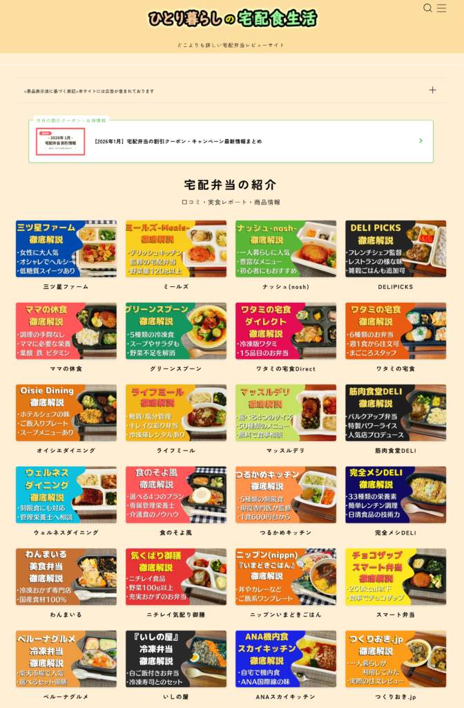 「ひとり暮らしの宅配食生活」は、冷凍宅配弁当に関する情報をまとめた比較サイトであり、運営者が実際に食べたリアルな感想を実物の写真とともに確認できる点が特徴です。